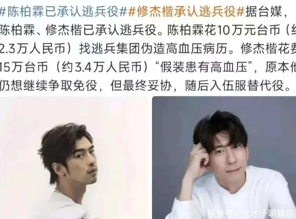 陈柏霖在笔录里说,他当年花10万台币,伪造了高血压病历,2011年就顺顺利利拿到免役资格了。修杰楷花了15万,也是造假高血压,结果只弄到个替代役名额,没完全逃掉。